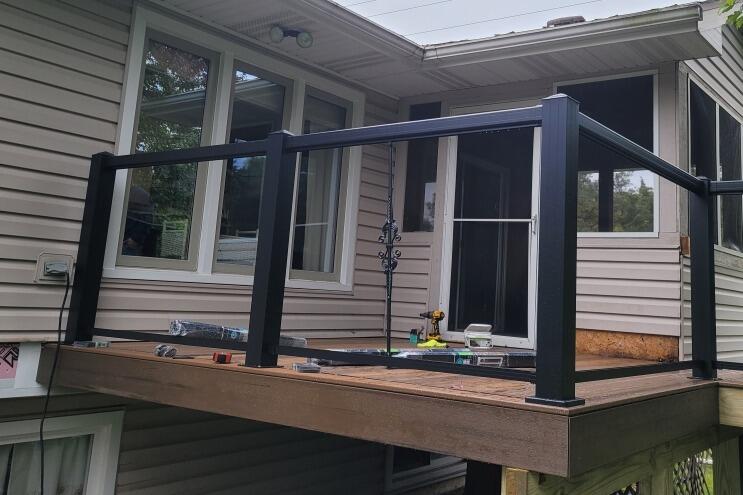 Check out this incredible deck transformation! We helped a customer swap their old deck for a brand-new DuraLife composite deck in Tropical Walnut. The warm, rich color combined with the striking black Regal railings creates a beautiful, low-maintenance outdoor oasis. Contact Infinity Home Improvement to build your dream deck today!