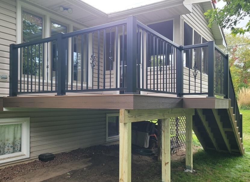 The deck features high-quality, low-maintenance Duralife Brazilian Cherry composite decking, creating a durable and inviting outdoor space. A regal bronze aluminum railing system with stairs leading down to the yard complements the home's design and provides easy access to the backyard.
