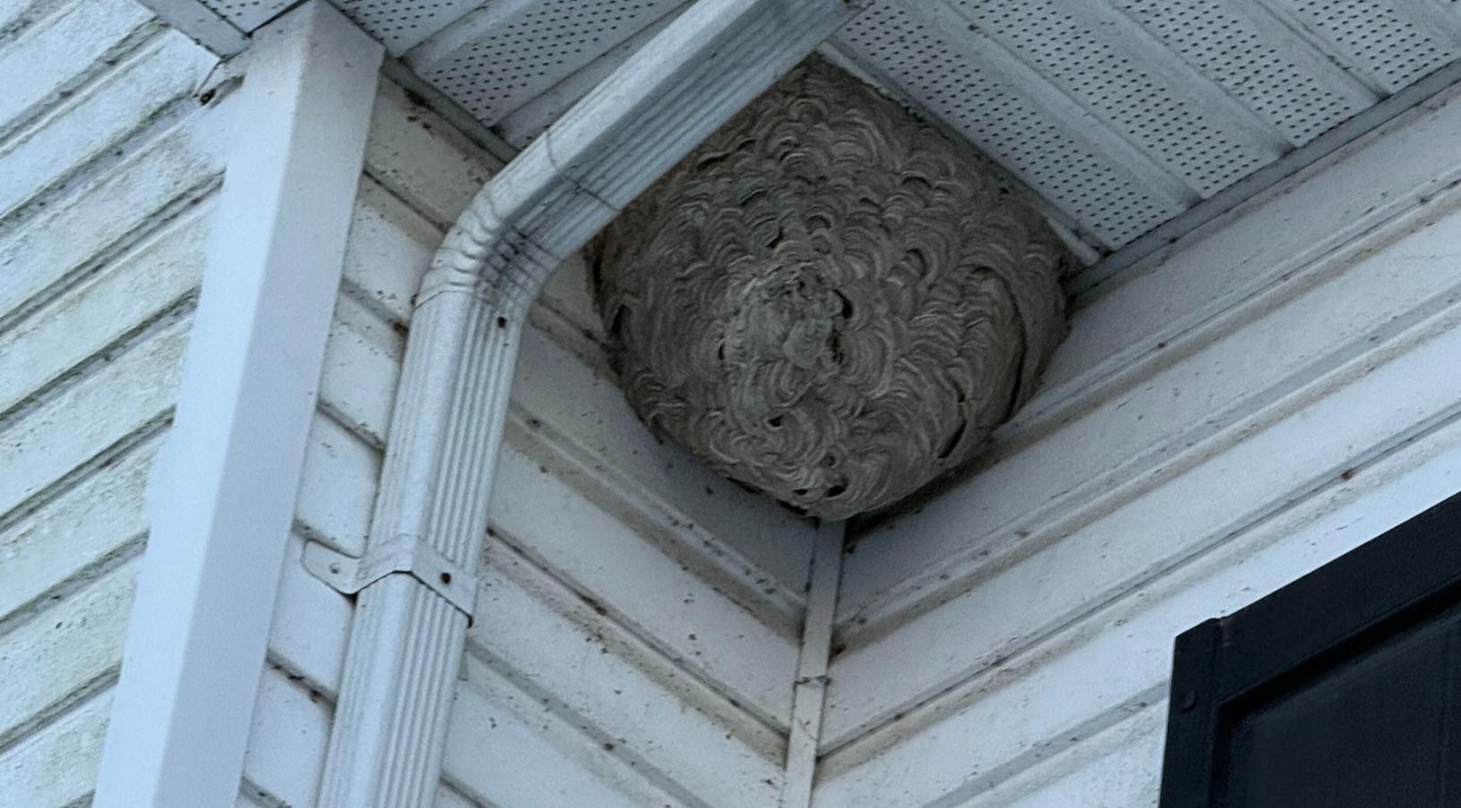 This customer in Oakhurst, NJ was cleaning his backyard one afternoon he spotted a basketball-sized bald-faced hornet nest underneath his soffit. Bald-faced hornets are aggressive stinging insects that have white markings on their face. They are one of the most aggressive and territorial stinging insects out there and if anything ventures within close proximity to their nest, they will not hesitate to attack.