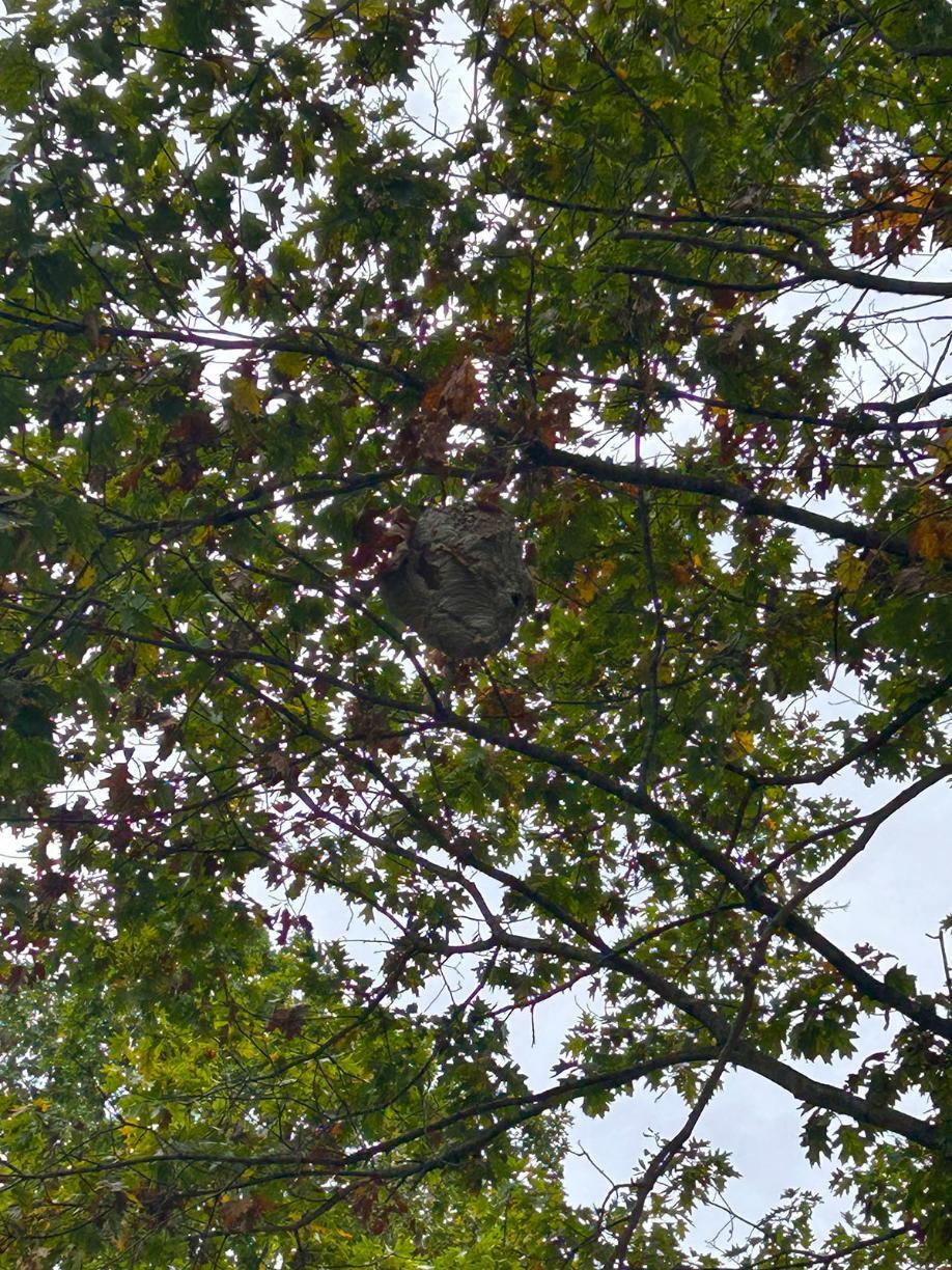 Since the nest was about 10 feet up, we grabbed our extendable pole, attached a knockdown aerosol application to the pole, and began treated the nest with that product. After a few moments had passed, we then treated the nest with a knockdown liquid application. Both of these products will rapidly exterminate the bald-faced hornets. A short while after treating the nest, we removed it (and the branch it was attached it) and disposed of them properly.