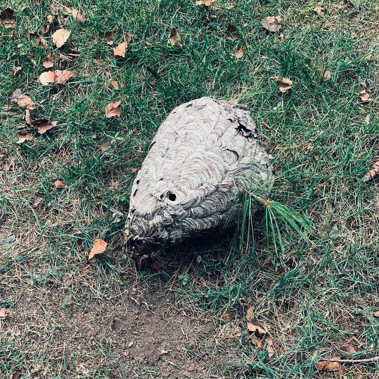 Bald-faced hornets have white markings on their face and are extremely aggressive and territorial. They won't waste a single moment to attack or sting anyone or anything that comes close to their nest. Using our extendable pole to reach the nest, we injected a knockdown dusting application. After several moments passed, we also injected a knockdown liquid application. These treatments will exterminate the bald-faced hornets almost immediately. A short while after neutralizing the bald-faced hornets, we removed the nest (and the branch it was attached to) and disposed of them.