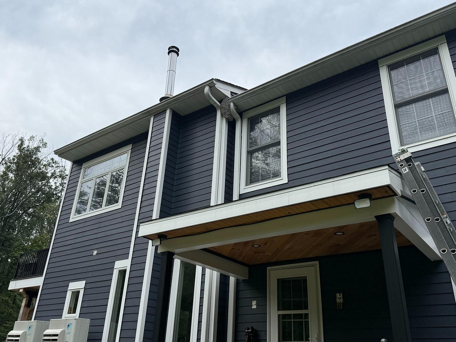 Since the nest was way high up on the roof, we grabbed our extendable pole, attached a knockdown aerosol application to it, and applied it liberally to the nest. This treatment rapidly exterminates the bald-faced hornets. A short while later, we removed the nest and applied a liquid residual to this area. This application with eliminate any returning bald-faced hornets and prevent them, and any other stinging insects, from building another nest.