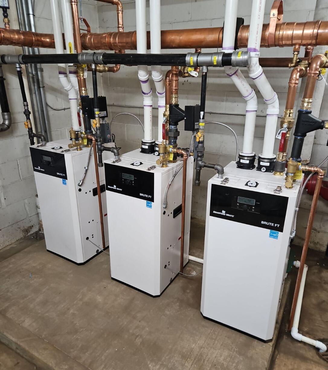 The facility trustees wisely settled on a modular approach for replacement. We installed (3) Bradford-White 95% efficient Brute boilers each with a 199,000 BTU input. They can each run as low as 20,000 BTUs. An outdoor sensor and boiler water sensor talk to the boilers and tell them how hot to make the water based on how cold it is outside. The boilers then ramp up or down to achieve that set point. Can you image the savings this facility is going to have in the coming years?! What a beautiful difference.
