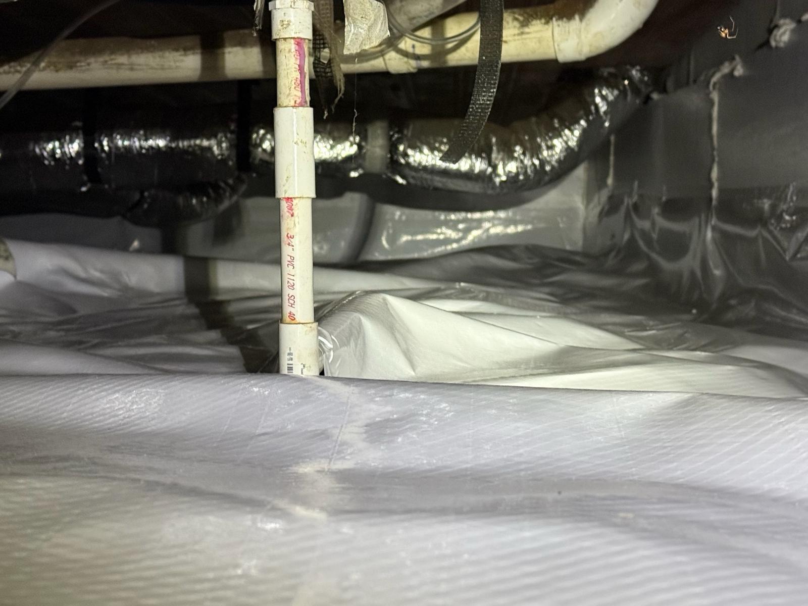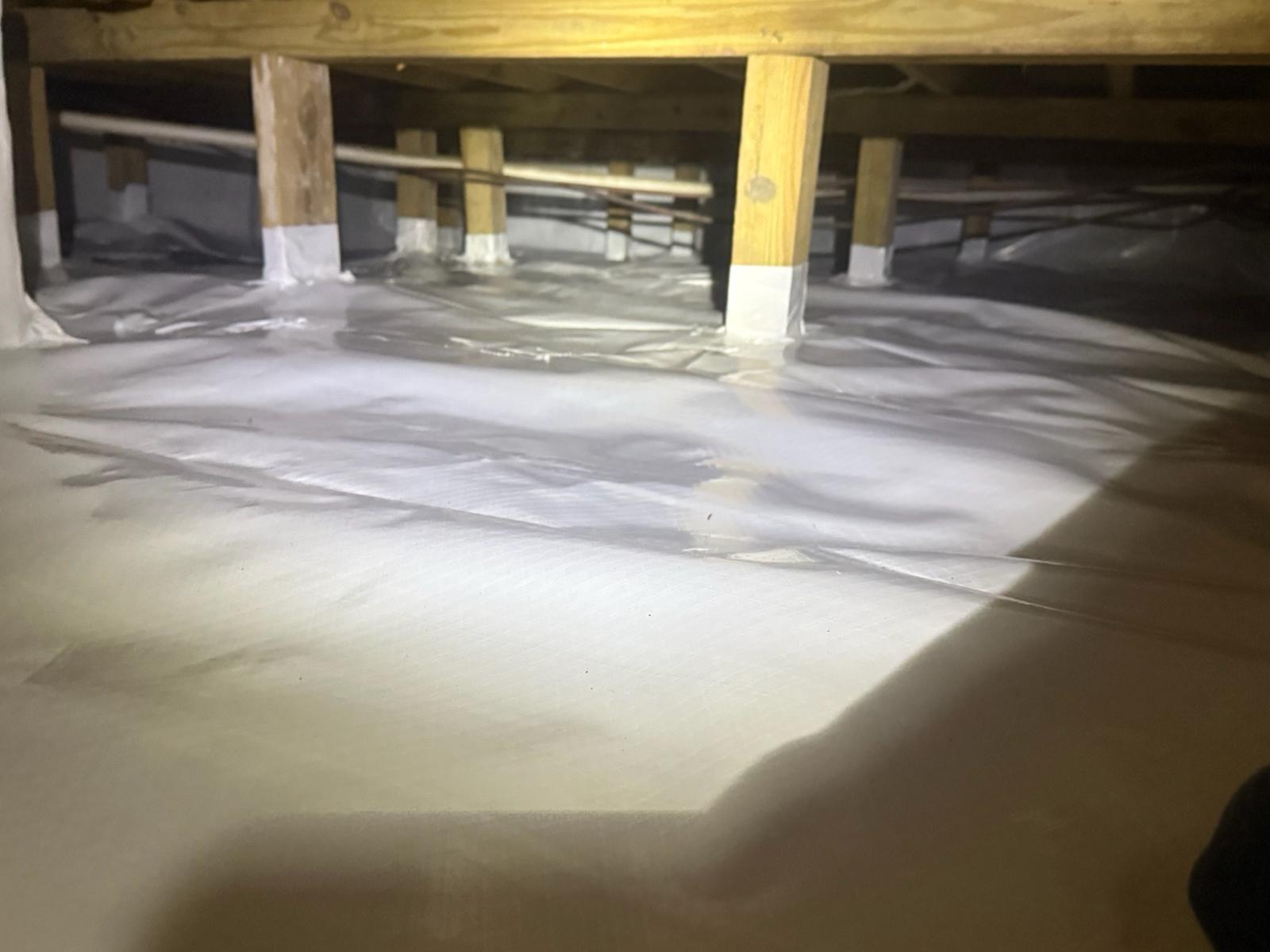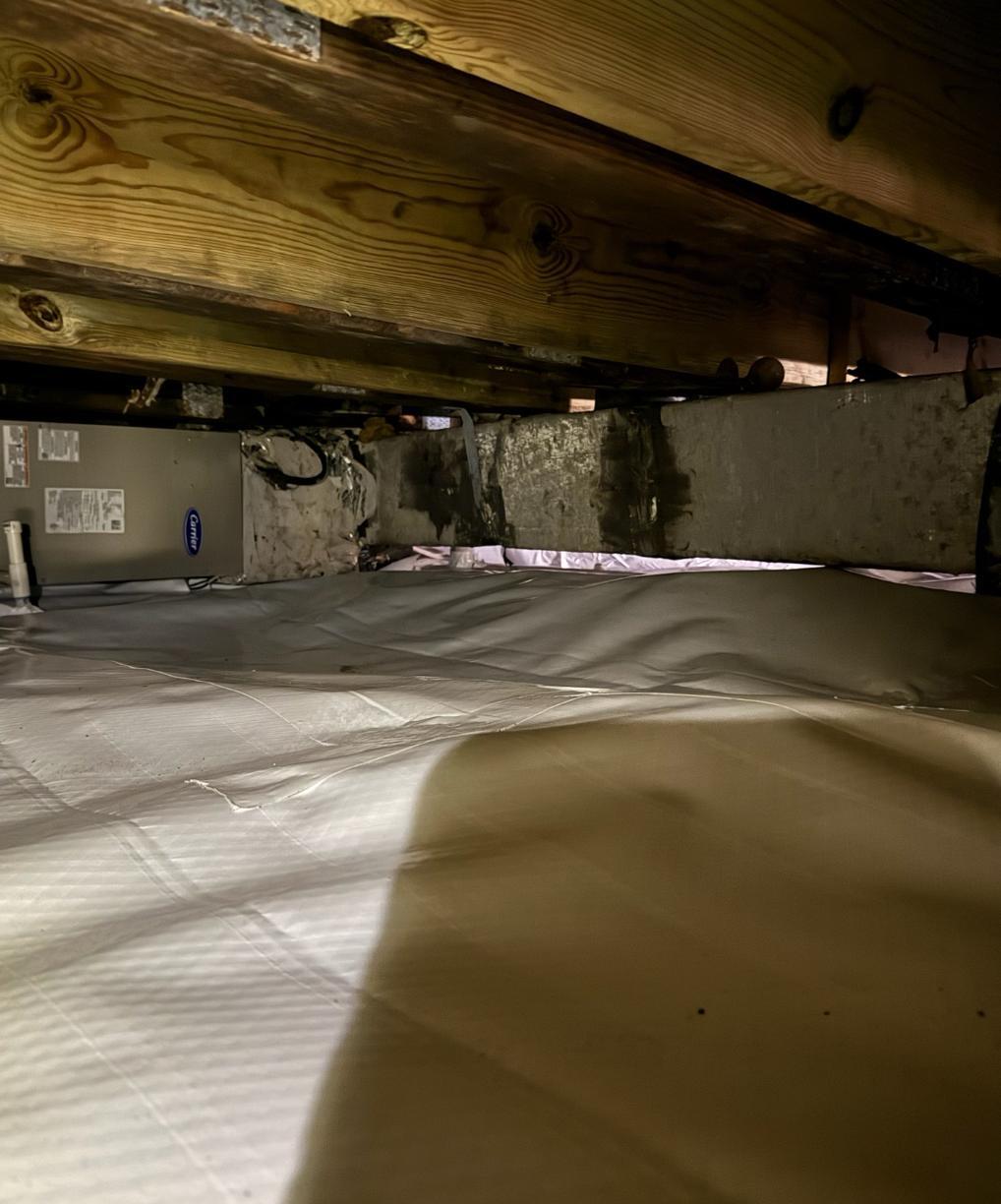 Second step is prevent cupping of wood floors. We suggest installing the Cleanspace encapsulation system that includes a custom-fitted vapor barrier, designed to mitigate airborne moisture and particulates. Cleanspace is not a waterproofing membrane, and does not offer protection from standing water. We install a dehumidifier, clean out/prep the crawl space, wrap piers, install a new access panel with weather stripping and secure it with toggle bolts.