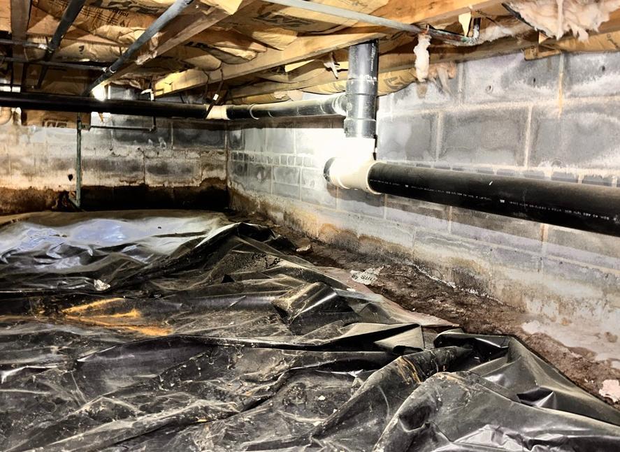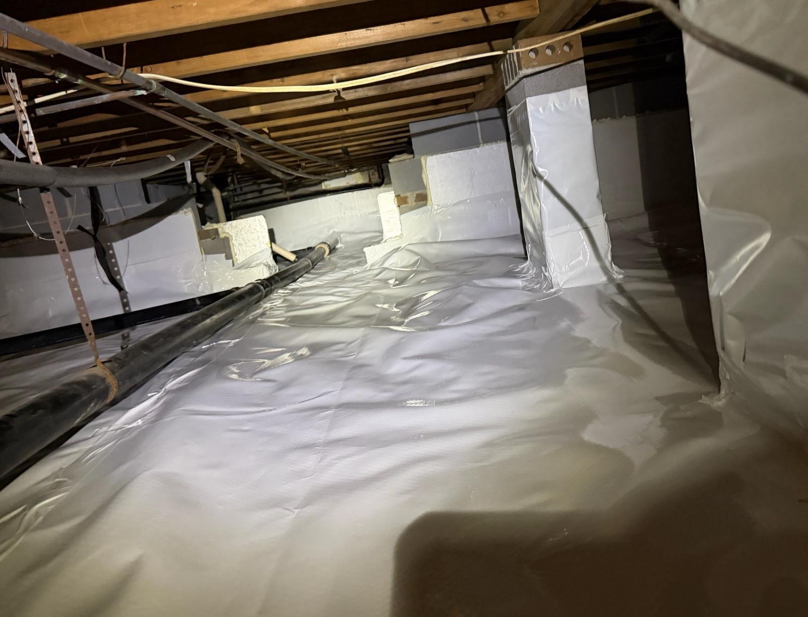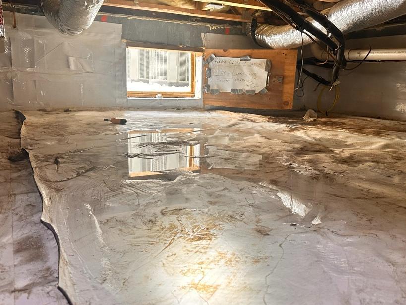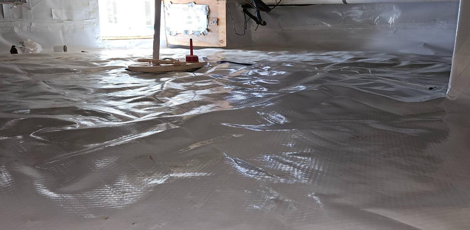 Second step is prevent cupping of wood floors. We suggest installing the Cleanspace encapsulation system that includes a custom-fitted vapor barrier, designed to mitigate airborne moisture and particulates. Cleanspace is not a waterproofing membrane, and does not offer protection from standing water. We install a dehumidifier, clean out/prep the crawl space, wrap piers, install a new access panel with weather stripping and secure it with toggle bolts.
