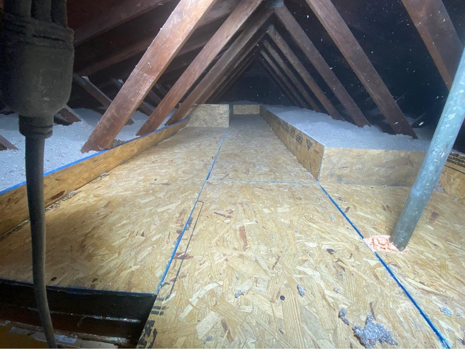 Remove And Dispose Of Existing Insulation. Attic is prepared for installation of fresh, clean insulation. Our team air sealed and insulated Scuttle Cover, air sealed with Zypfoam all penetrations. Installed SilverGlo™ on wall and between floor joists as needed and they also applied Trusoft cellulose to the attic floor.